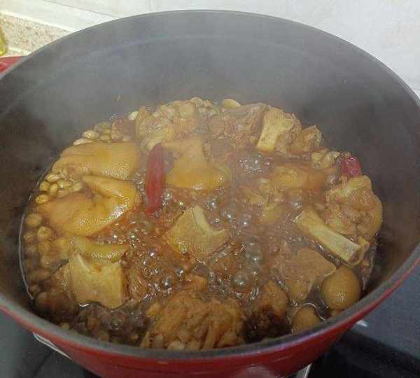 第9步、湯汁濃稠時關火,用筷子戳一下豬蹄能紮透就是燉好瞭。