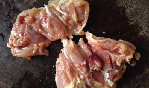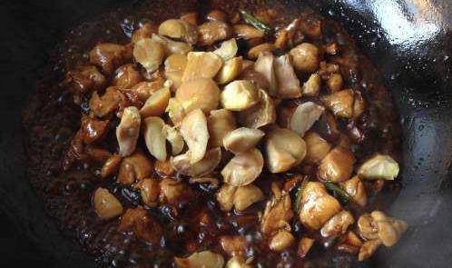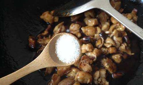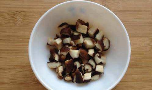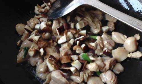 起油鍋,油熱後倒入雞塊,中小火煸炒至變白,倒入香菇丁炒制片刻