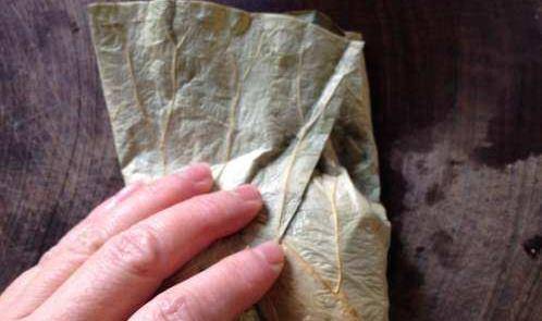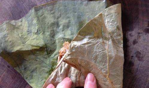 將泡軟的荷葉洗凈後,分割成4份,取其中一份,放上適量糯米雞飯(註意,別放太多,否則容易撐破)