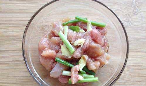 雞丁中放入料酒、蔥段、薑片、少許鹽、2g生抽、少許白胡椒粉、再倒一點玉米油攪拌均勻,醃制30分鐘