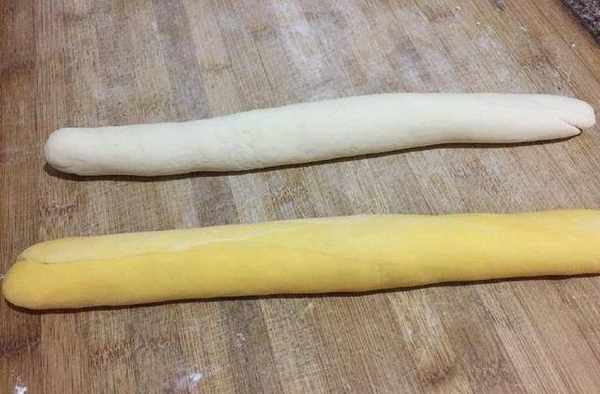4、兩種面團取出後揉均搓成長條。
