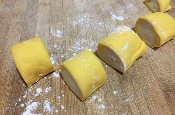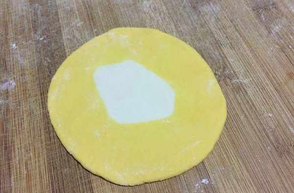 5、把南瓜面團搟成長方形片,中間放入白色面團包起。