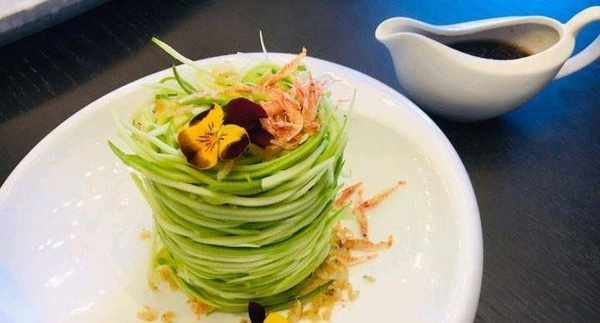 雲南小瓜絲泡冰水備用,利用圓形模具打底圍邊裝盤