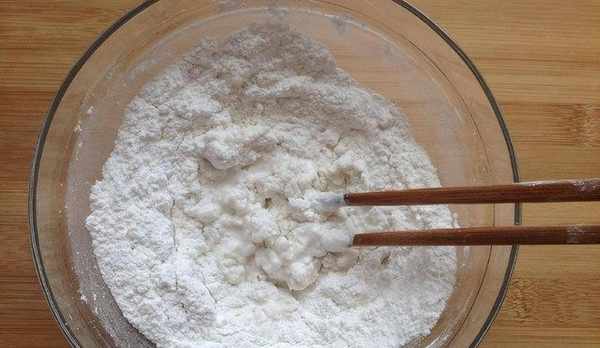 將稱好的糯米粉100克和粘米粉20克以及30克白糖都放到一個大碗裡,然後用筷子攪拌均勻。