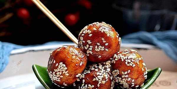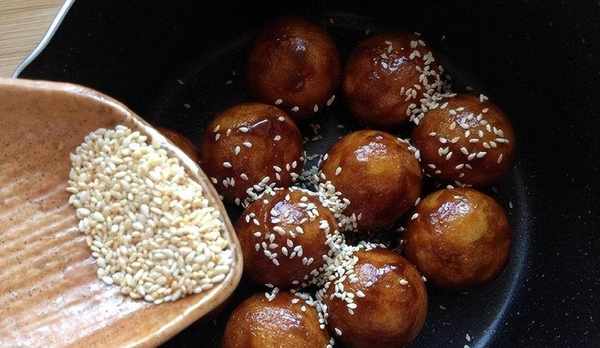 等油果子 沾滿紅糖,外表焦黃,外殼變硬就可以關火瞭。關火後盛出,趁熱在上面撒上一些熟的白芝麻就好瞭。