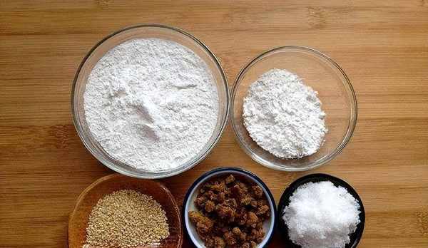 糯米粉 100g、粘米粉 20g、紅糖 30g、白糖 30g、溫水 85g、熟白芝麻 5g、油1勺