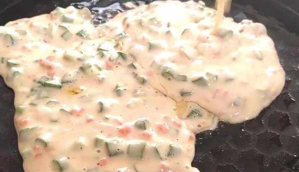 然後再添加鹽、雞精、五香粉調味,用筷子給它攪拌均勻。少量多次地添加面粉,每次添加面粉攪勻後再添加下一次。最後攪成這種稠一點的面糊,把攪好的面糊放在一邊,靜置10分鐘,電餅鐺預熱,刷油溫熱的時候倒入面糊,用鏟子給他攤平,蓋上蓋子烙兩分鐘,打開蓋子翻個面。