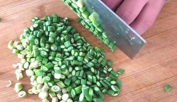 先把蒜苔帽給切碎,平時很多人在摘菜的時候把蒜苔帽都扔掉瞭,其實蒜苔帽吃起來也非常好吃,蒜苔帽盡量切的碎一點。把切好的蒜苔帽放入碗中,切一點胡蘿卜片,改刀切成胡蘿卜絲,最後切成胡蘿卜小丁,把胡蘿卜小丁放入碗中,打入兩個雞蛋。