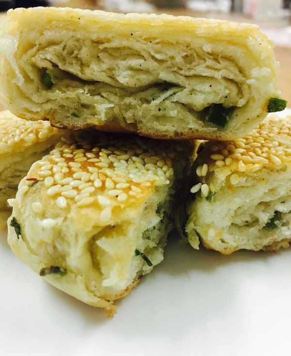 第三步:醒發好的面搟成大片,然後在表面均勻的抹一層燙好的油酥,接著撒一層蔥花,從上向下卷起,揪劑子然後團成圓形沾水沾芝麻,上餅鐺上烙成兩面金黃即可