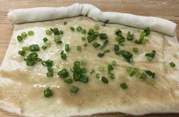 第一步:面粉裡加入少許酵母用溫水和成面團醒發半小時備用(一斤面放三克酵母)小蔥改刀切蔥花