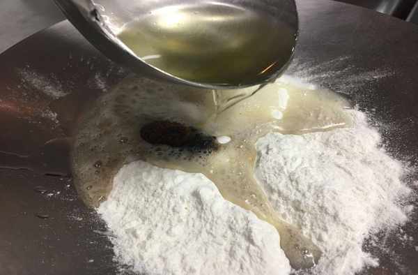 第二步:鍋上火加熱下油,面粉裡加入少許胡椒粉、鹽,用熱油直接澆到面粉裡攪勻備用