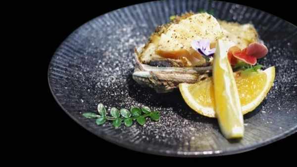 從鍋中取出鮑魚撬開鮑魚殼,清除內臟後放入冰水中10分鐘,將鮑魚從冰水中取出,用廚房紙吸幹水分後切成塊擺盤。