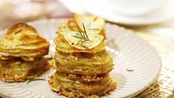 把醃制好的土豆片鋪在墊有吸油紙的烤盤上,一片土豆放入適量的芝士碎、培根丁再疊一片土豆片,每一份大致疊8-10片,直至土豆疊完。