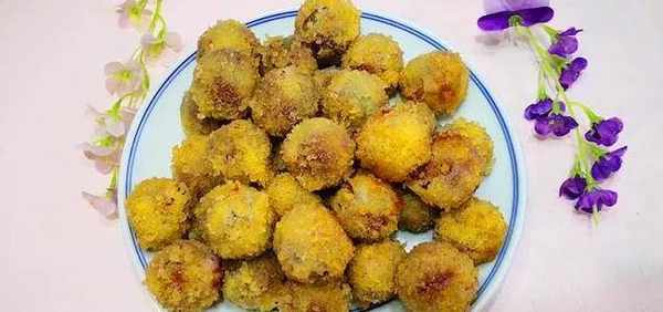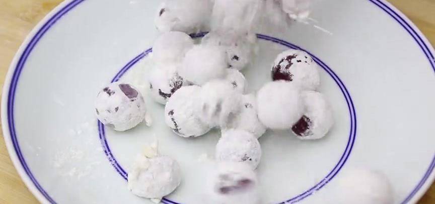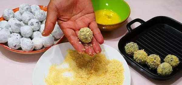 然後在葡萄上面再撒點水,最後再倒回面粉裡再次裹上面粉,裹滿面粉後備用,然後在碗裡打入一個母雞蛋,攪拌均勻備用。在準備150克的面包糠,先把葡萄放在蛋液裡,轉一圈沾滿蛋液,再裹上一層面包糠。