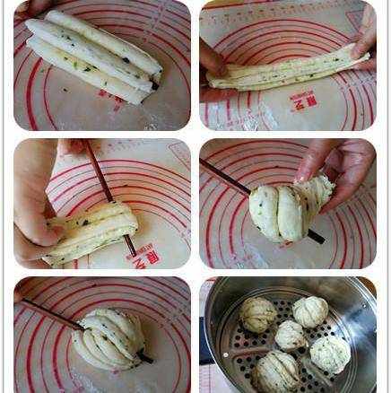 18.起鍋燒水,蔥油花卷上鍋蒸15分鐘,可以在蒸屜上面刷些植物油,可以有效防止粘連。蓬松美味的花卷就完成啦!