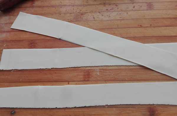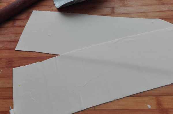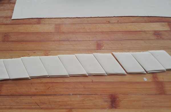3、將醒發好的面團取出放在案板上,用搟面杖將其搟成薄片,越薄越好,將其切成整齊的長方形。