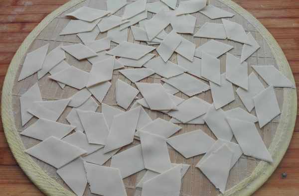 5、將其切好的長條面片,分別在其上面撒上點幹粉,摞在一起,斜著切成菱形。