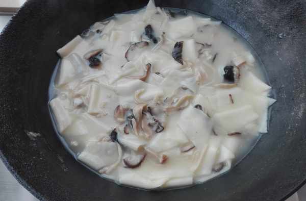 9、鍋中這些底湯燒一兩分鐘,就可以將前面制作好的面片放入鍋中,將其攪拌均勻。