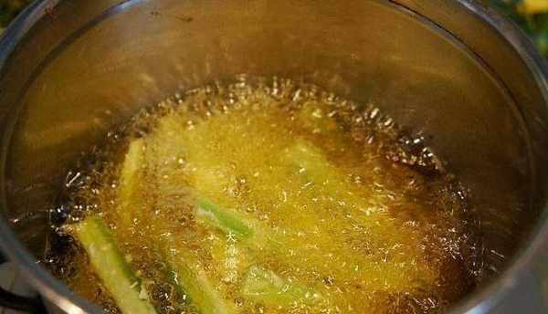 6、鍋中加入適量的油,7成油溫下入裹好面糊的蘿卜條,小火炸;