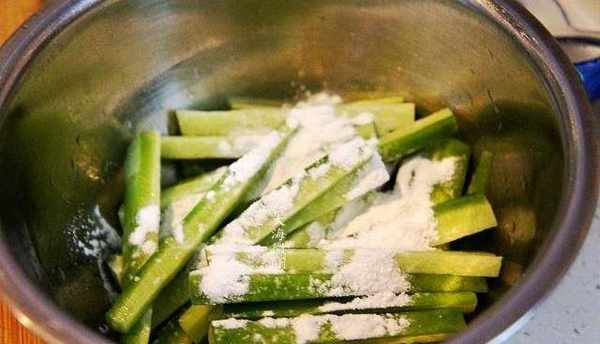 2、青蘿卜根據自己喜歡的寬度和長度切條,撒適量的鹽醃制15分鐘左右,把蘿卜醃制出水分;