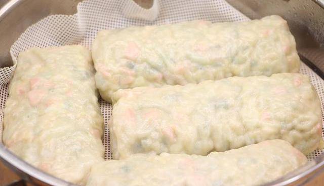蘿卜,這樣做真的是太香瞭,大人孩子都非常喜歡。我這裡選擇的是青蘿卜,還可以換成其他的蘿卜。洗幹凈的蘿卜擦成細絲。擦成絲以後,先放一旁備用瞭,接著加入200克面粉,加入兩克食用鹽,增加下面粉的勁性。混合一下,再加入70度左右的溫水,邊加邊攪拌。