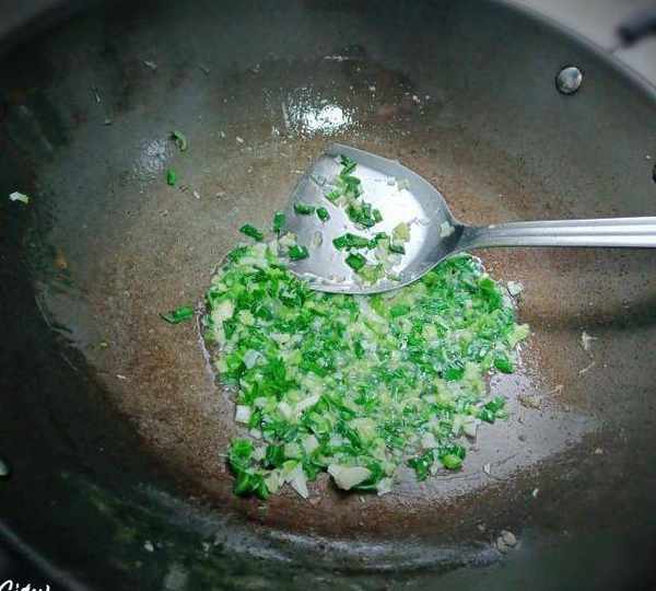 第7步、用炒臘腸的油來炒切好的蒜苗。