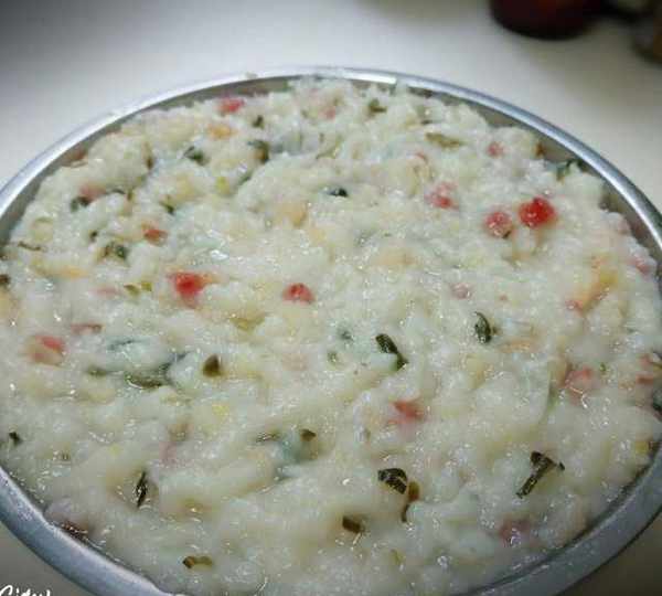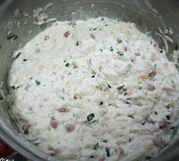 第9步、將剛剛炒好的材料全部放進調好的粘米粉水裡面,加入適量的鹽調味。