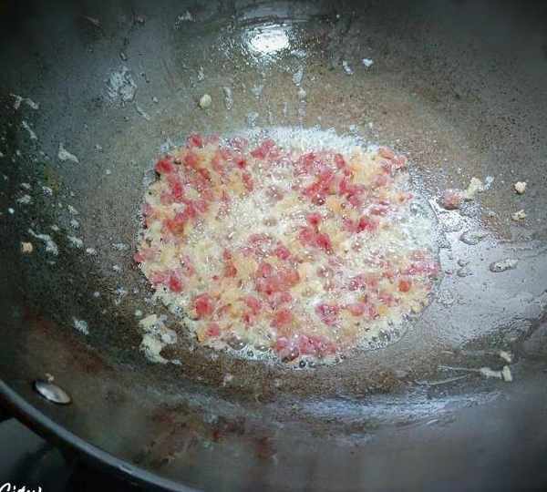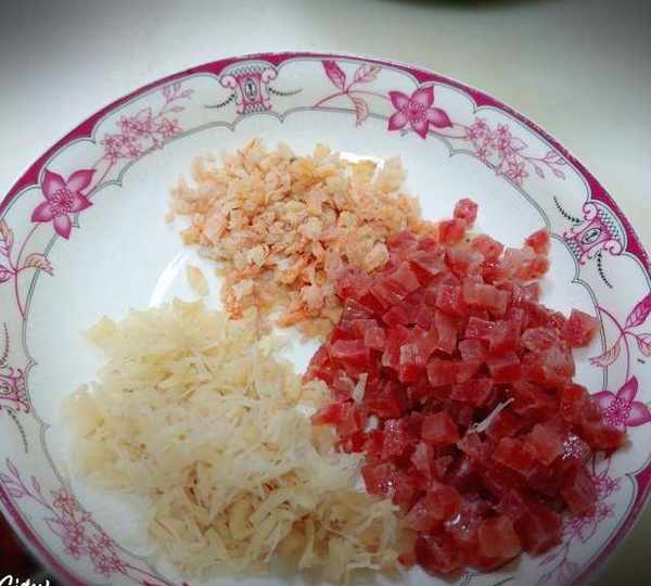第6步、熱鍋下油把臘腸蝦米幹貝炒香,然後盛起來。