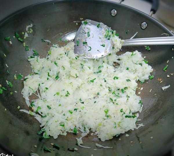 第8步、炒香後放白蘿卜絲炒,大概炒2分鐘左右。