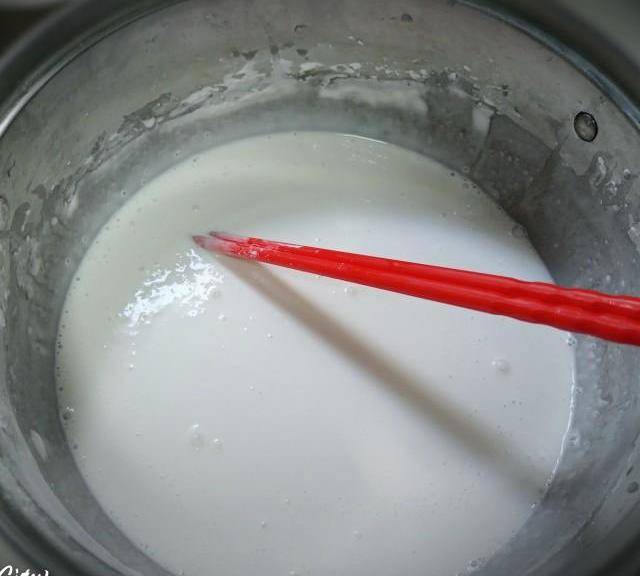第4步、用水調淀粉和粘米粉,水的分量大概是250ml,我忘記稱瞭,是稠而不稀的狀態。