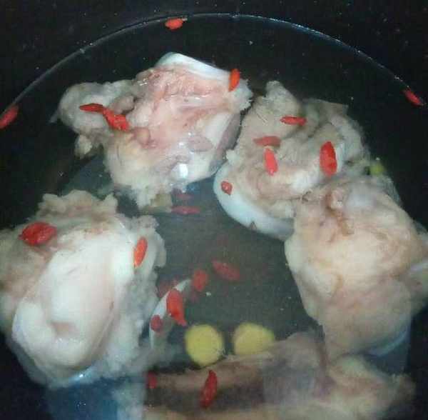 4.把大骨,薑塊切片,枸杞放進電壓鍋裡,同時也滴幾滴醋進去一起煮,按“蹄筋檔”煮個40分鐘左右。