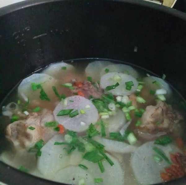 7.十五分鐘後,放氣,開鍋,加進適量鹽,雞精,拌勻,最後撒上蔥花,至此,湯做好瞭。