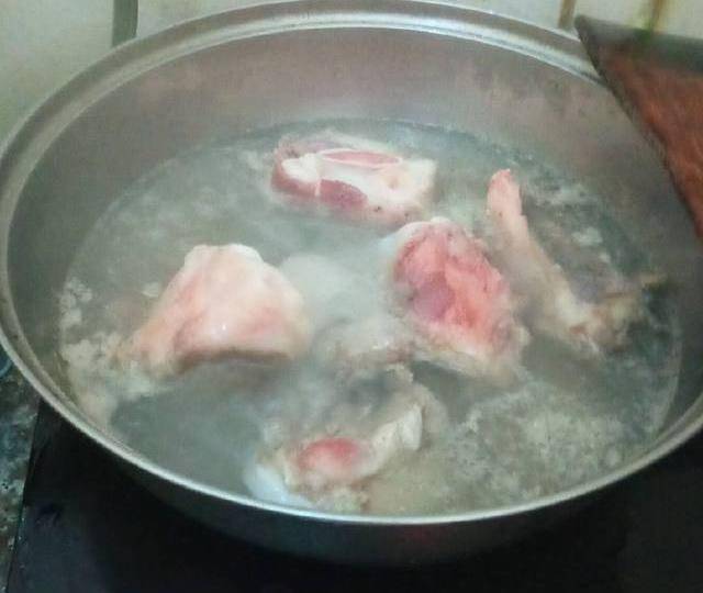 2.鍋裡放適量水,燒開,把大骨洗幹凈放進去,同時倒一瓶蓋料酒進去一起煮,去腥。