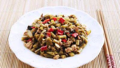 2、肉末煸炒後, 再翻炒酸豆角, 再放入茄子進去翻炒, 加入少許水燉煮;