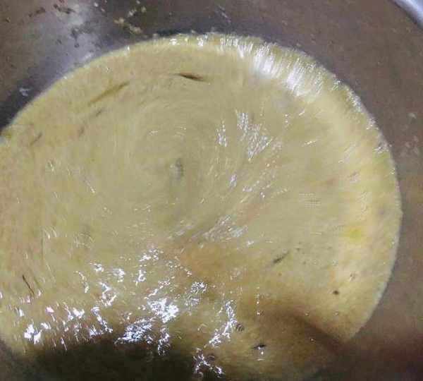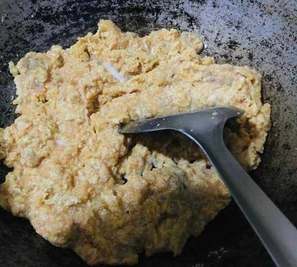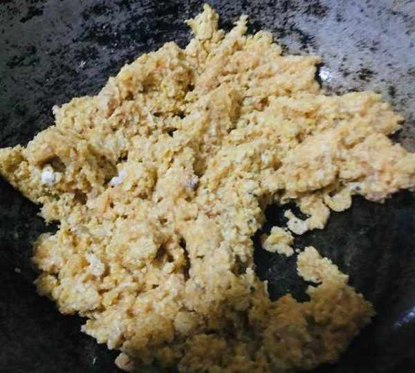 第5步、炒鍋上火放油燒熱,倒入魚籽。隻要下面凝固就翻身,不停翻炒。