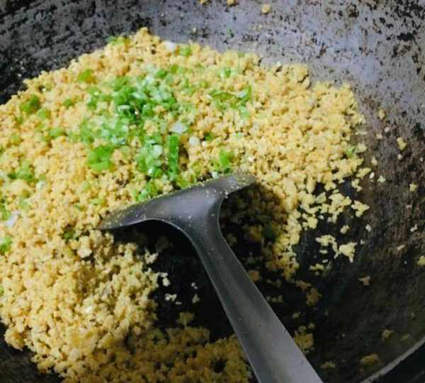 第8步、沙沙的感覺,這時撒上蔥花,稍加翻炒,即可出鍋裝盤。