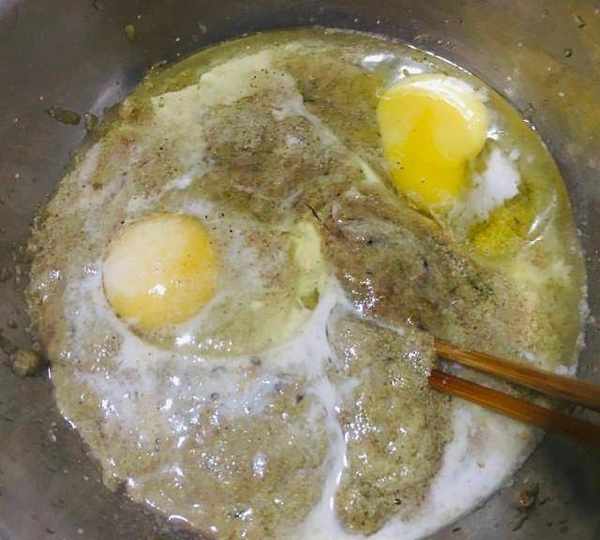 第3步、魚籽入盆,加鹽、雞蛋、蔥薑汁、胡椒粉、白酒、味精、水淀粉。