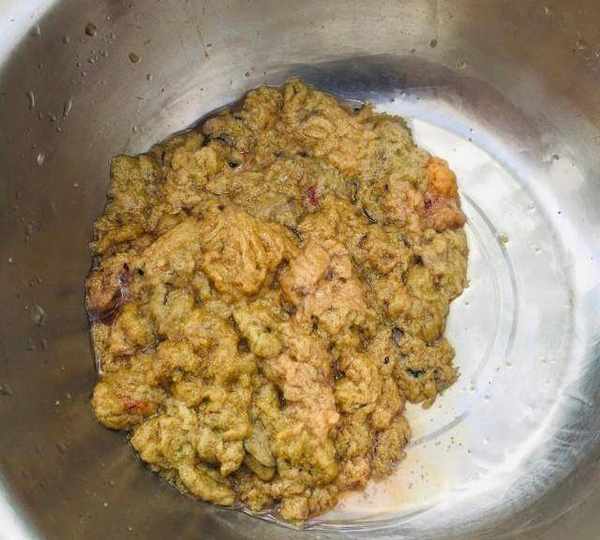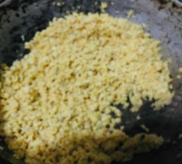 第6步、從大塊濕團到小塊結團,不停翻炒。