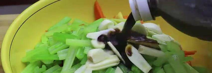 這個時間蘿卜也醃好瞭好多的蘿卜汁,該水分撈出來放到另一個盆中,把晾幹的芹菜也放進來,蒜片薑絲也放進來,再加入一勺食用鹽,生抽、香醋、好油,再加上一點高度白酒,然後用手抓拌均勻,加入高度白酒,這樣可以放的時間更長一些。像這樣蓋上保鮮膜放到冰箱裡半個月也不會壞,想吃的時候再滴點小磨香油,胡蘿卜搭配芹菜就做好瞭。