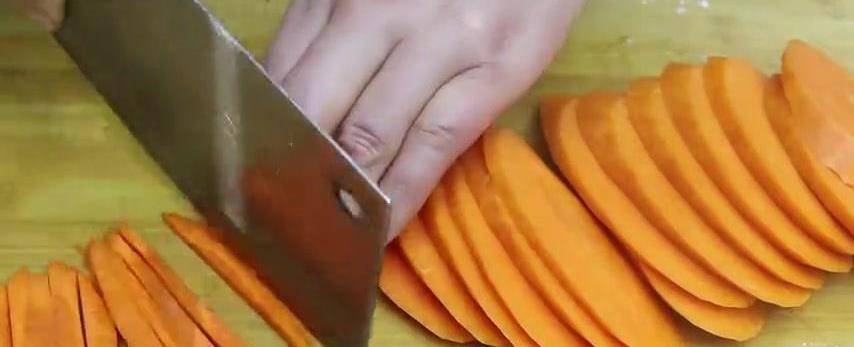 再準備一根削去外皮的胡蘿卜,先切成斜刀片,再切成寬條,全部切好以後,收到盆中在裡面加入兩勺食用鹽,同樣用手抓拌均勻,醃過的胡蘿卜口感會更加的爽快,同樣也醃制10分鐘,再準備幾瓣蒜切片,一塊生薑先切片,再切絲,再準備一鍋清水,把醃好的芹菜焯水30秒,焯好以後撈出,再放到涼水裡面,然後再烘幹水分撈出來。
