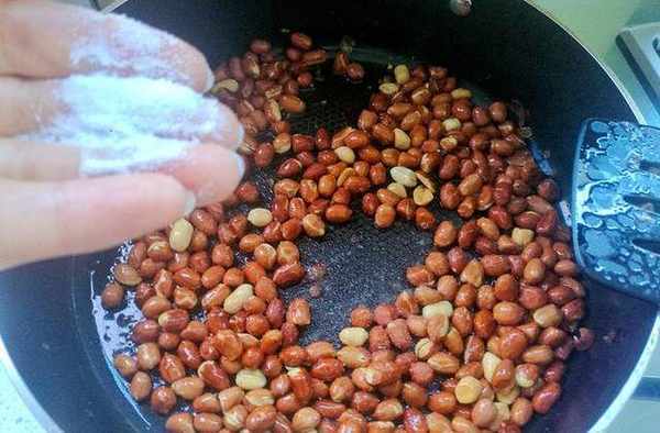 4、花生米炸到稍微有些變色,鍋裡的花生米從最初翻炒時候的澀澀的感覺變成很順滑,聽到噼裡啪啦的聲音,基本上花生米就炒好瞭。趁熱撒上適量的鹽,喜歡吃白糖的撒上白糖,再撒上適量的白酒,翻炒均勻。