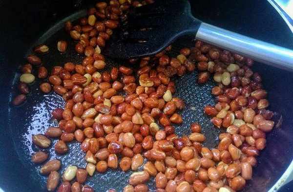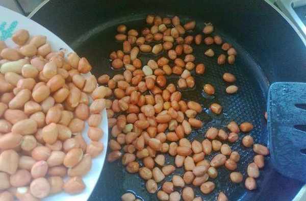 3、把火關小,中小火就行,然後用鍋鏟慢慢翻炒。勤攪動別犯懶,不然花生米容易糊。炸糊瞭的花生米含有大量的致癌物,為瞭自己的身體健康,不要舍不得,趕緊扔瞭吧!