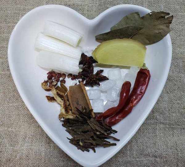 第3步、準備鹵料:蔥3段,香葉2片,薑3片,八角2個,冰糖8、9粒,幹辣椒2個,桂皮1塊,陳皮絲1把,花椒10多粒,茶葉1把,很喜歡茶葉的清香,所以加瞭一把,可以不加。