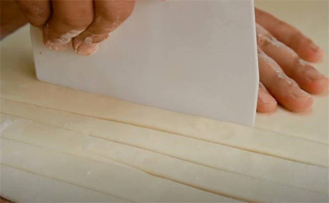 3.借助刮板或者菜刀先切長條。