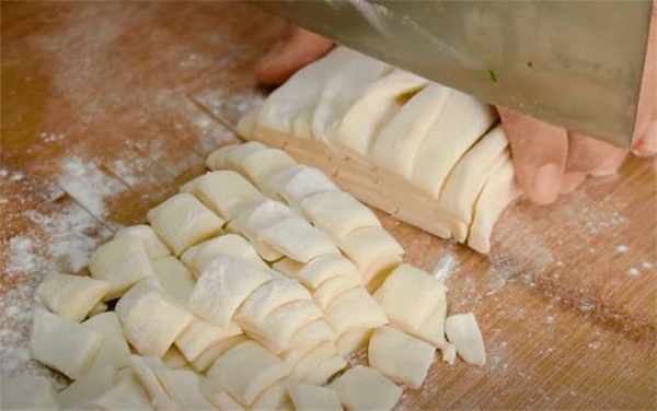 4.抖一抖撒一些幹粉防粘,把長條都摞在一起,切成長方形的小面塊。