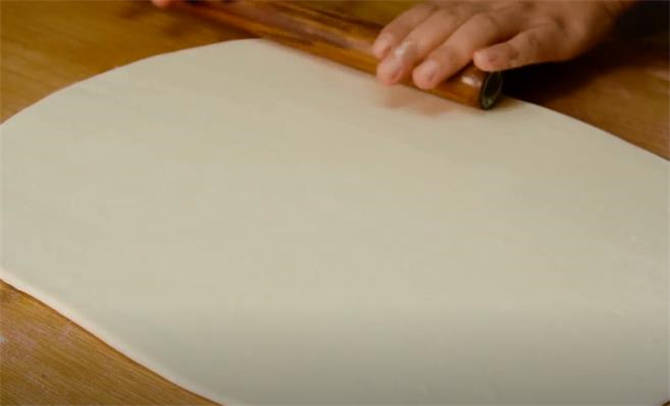 2.時間差不多到瞭,面團餳好之後取出來,稍微揉兩下按扁,搟成一張有厚度的長方形的餅皮。