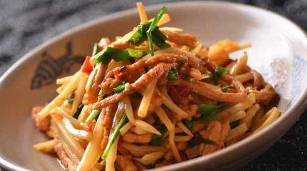 竹外桃花三兩枝之竹筍炒肉,竹筍具有滋陰涼血、清熱化痰、解渴除煩、清熱益氣、利尿通便、解毒透疹、養肝明目、消食等功效,竹筍炒豬肉還可以降低血糖。焯水後的竹筍少瞭澀味,多瞭竹子的清香,再配上滑嫩的肉絲,入口香味彌漫,美味至極。