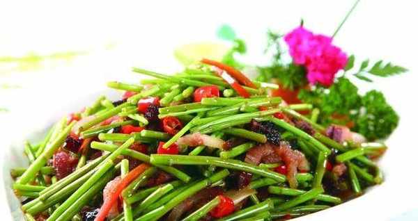 蔞蒿滿地蘆芽短之蔞蒿炒臘肉,蔞蒿不僅美味,還有較高的營養價值,含有許多維生素和礦物質元素,具有降血壓、降血脂、緩解心血管疾病等功效,是一種典型的保健蔬菜。翠綠的蔞蒿配上暗紅的臘肉絲及火紅的辣椒,色澤分明,清香撲鼻,入口香味彌漫,經久回味,
