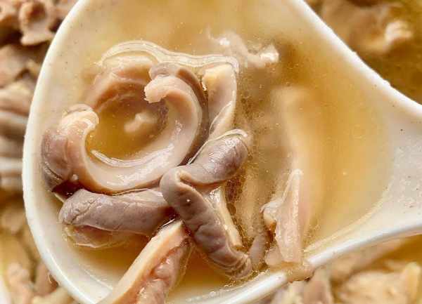 1.豬肚清洗幹凈,冷水下鍋焯水,加入料酒薑片去腥,焯水後撈出瀝幹水分放涼,再切成細條放入燉鍋中。