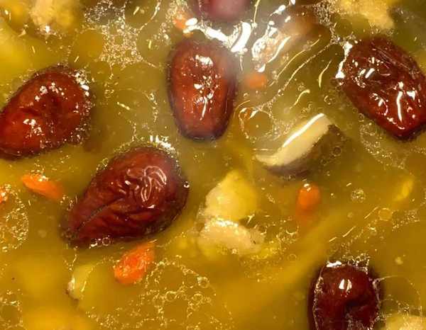 3.加入幾顆去核紅棗和薑片,加入適量清水,中小火燉煮2個小時,再加入食鹽調味即可出鍋,湯汁鮮美,可口好喝。